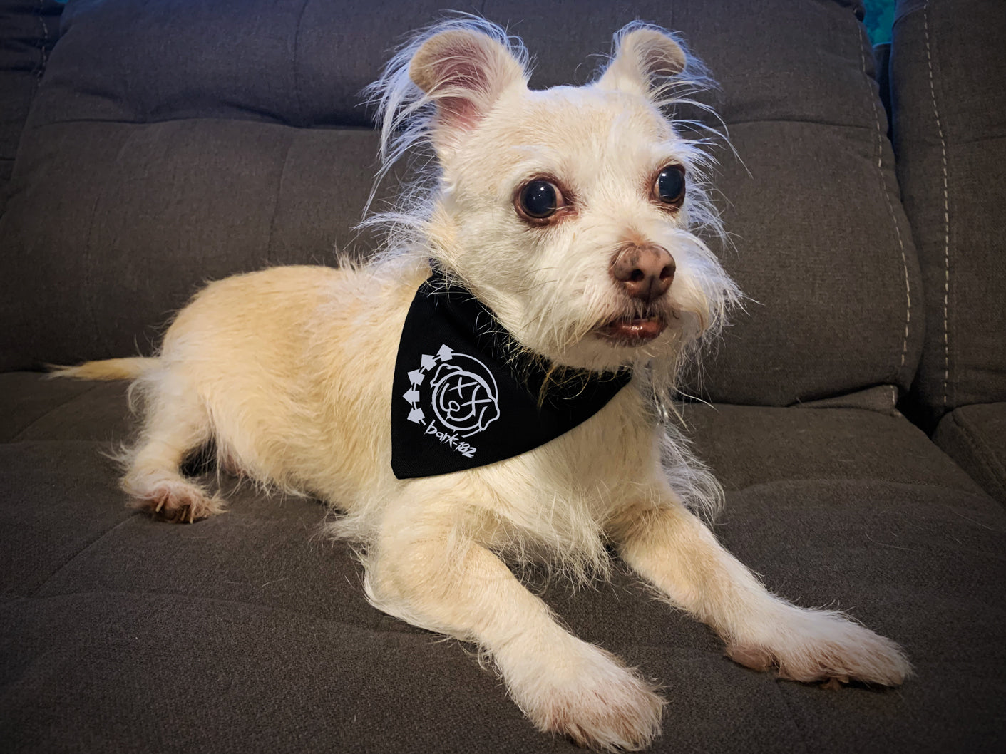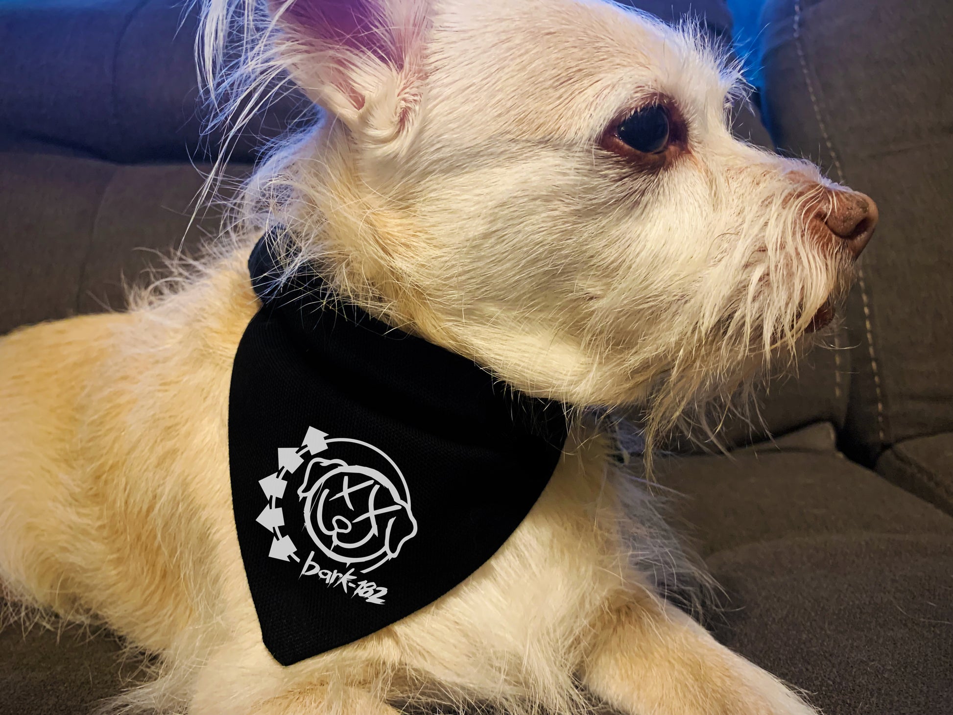 punk sh*t for your fur babe! featuring the "bark-182" slide-on / over-the-collar blink-182 dog bandana perfect for blink-182 fans. this bandana slips right over your dog's collar for an easy, comfy fit. the bandana comes with a removable and adjustable black collar too!