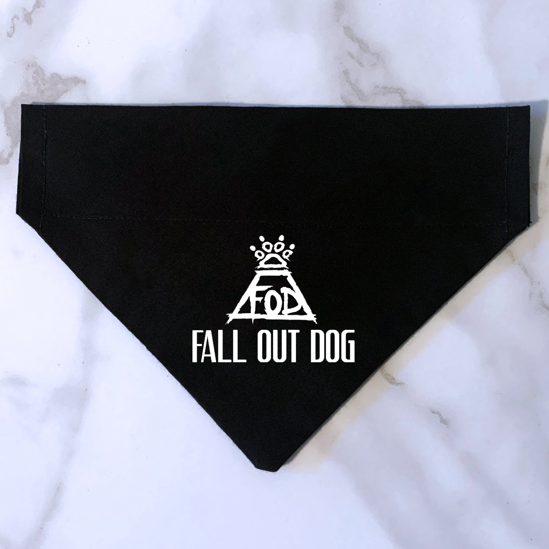 punk sh*t for your fur babe! featuring the "fall out dog" save rock & roll slide-on / over-the-collar fall out boy dog bandana perfect for fob fans. this bandana slips right over your dog's collar for an easy, comfy fit. the bandana comes with a removable and adjustable black collar too!
