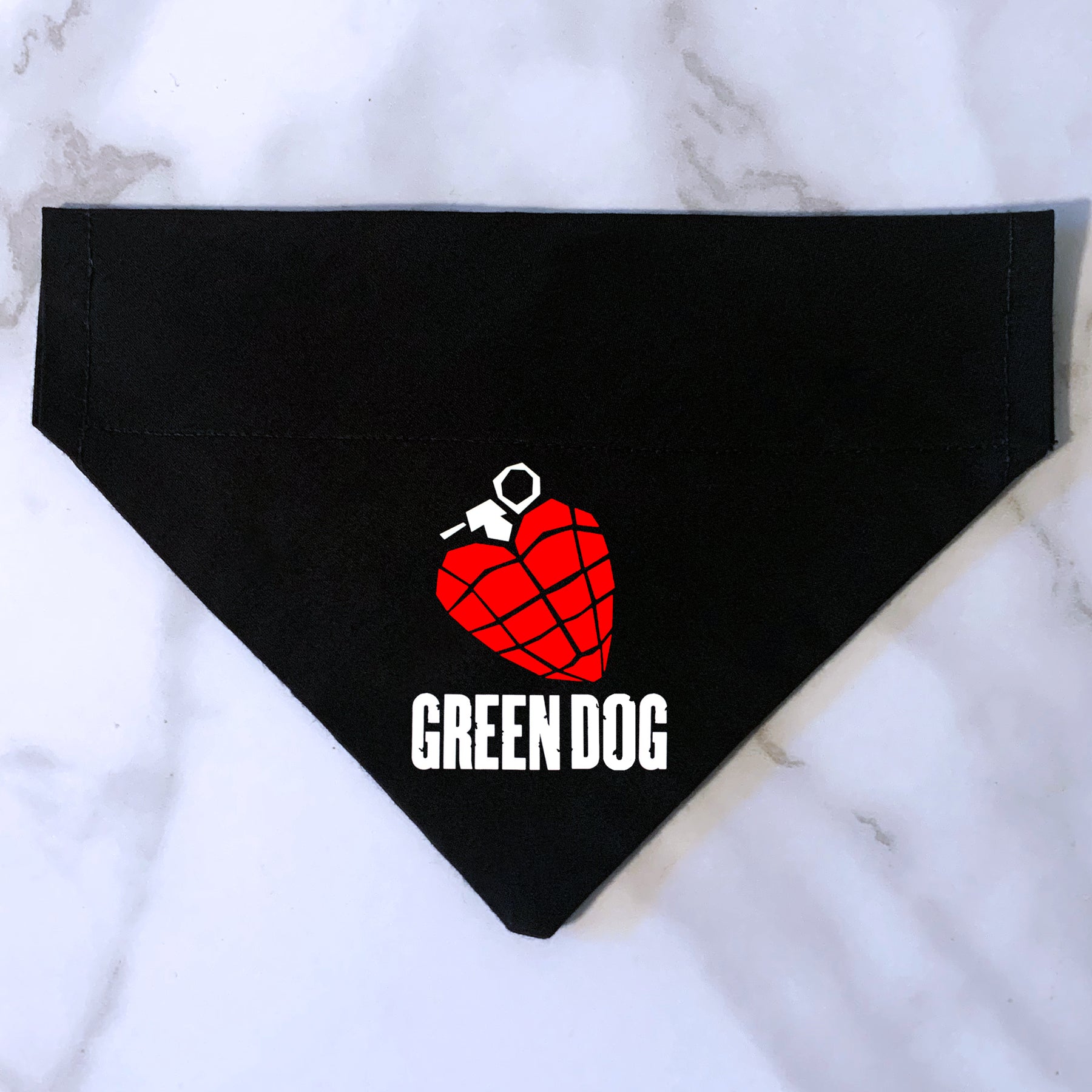 punk sh*t for your fur babe! featuring the "green dog" slide-on / over-the-collar dog bandana perfect for green day fans. this bandana slips right over your dog's collar for an easy, comfy fit. the bandana comes with a removable and adjustable black collar too!
